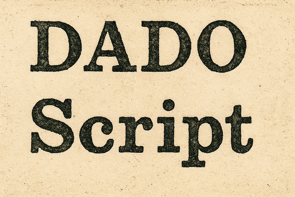 Esqueçam técnicas e regras tipográficas na criação desta fonte, não segui nenhuma, pois é a minha letra escrita manualmente e digitalizada para um arquivo TTF (TrueType Font) e batizada de Dado Script. Quando escrevo manualmente minha letra não é de fácil leitura, pois ela não é uma letra cursiva (emendada), mas, por conta da velocidade de escrita muitas letras se emendam e criam uns verdadeiros Frankenstein da escrita.